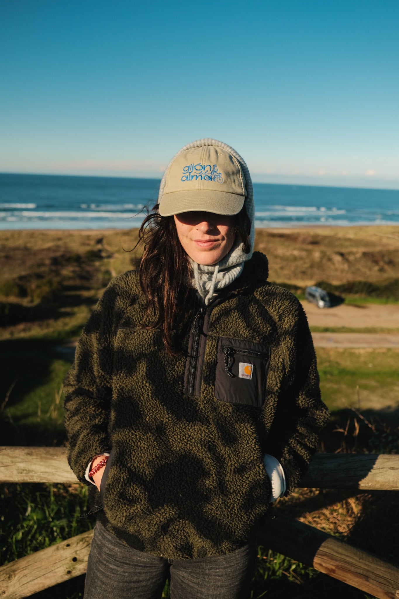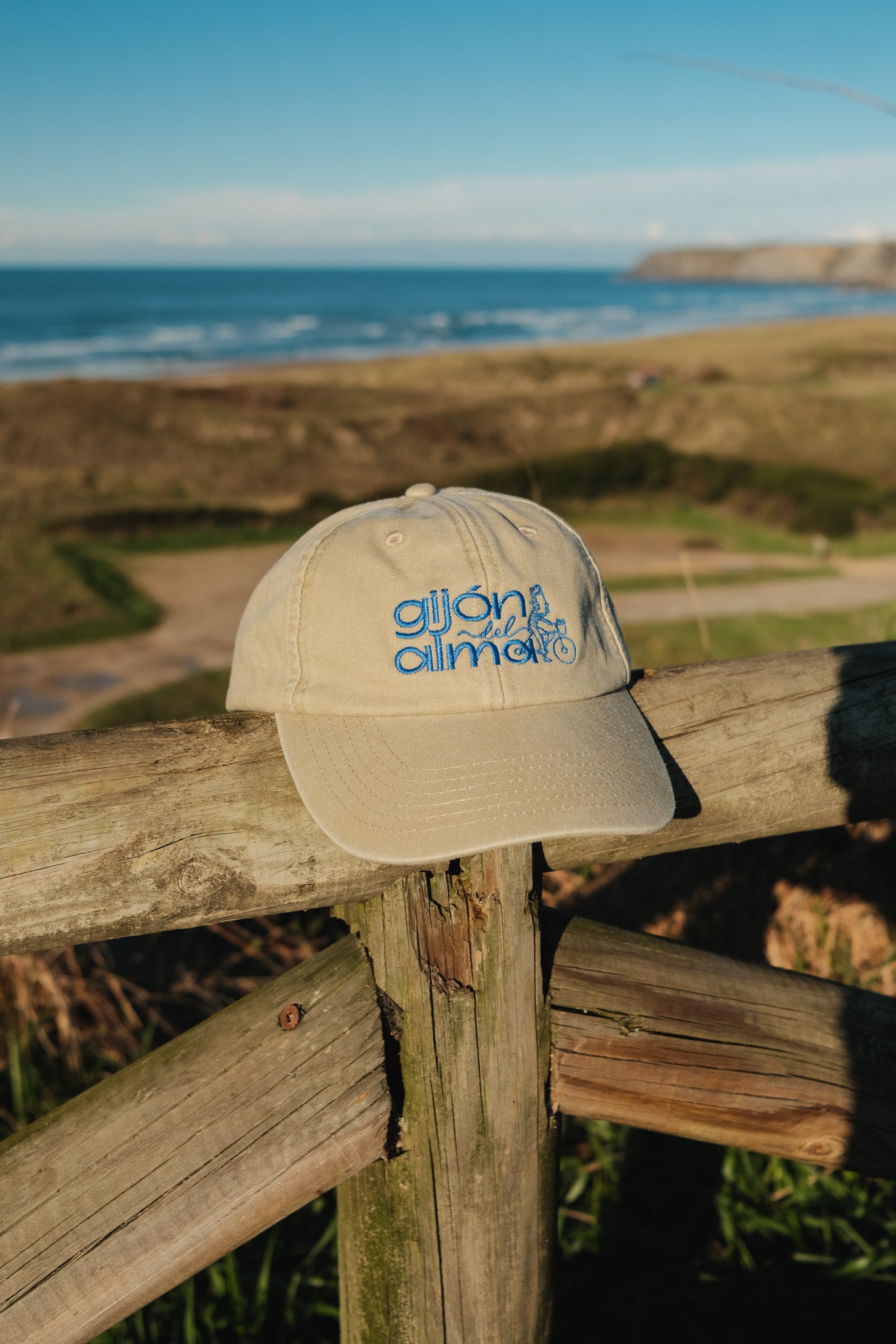 Gorra de perfil bajo estilo vintage en algodón lavado. Color arena y bordado frontal con el logo de Gijón del Alma en azul marino. Ajustable con hebilla metálica.