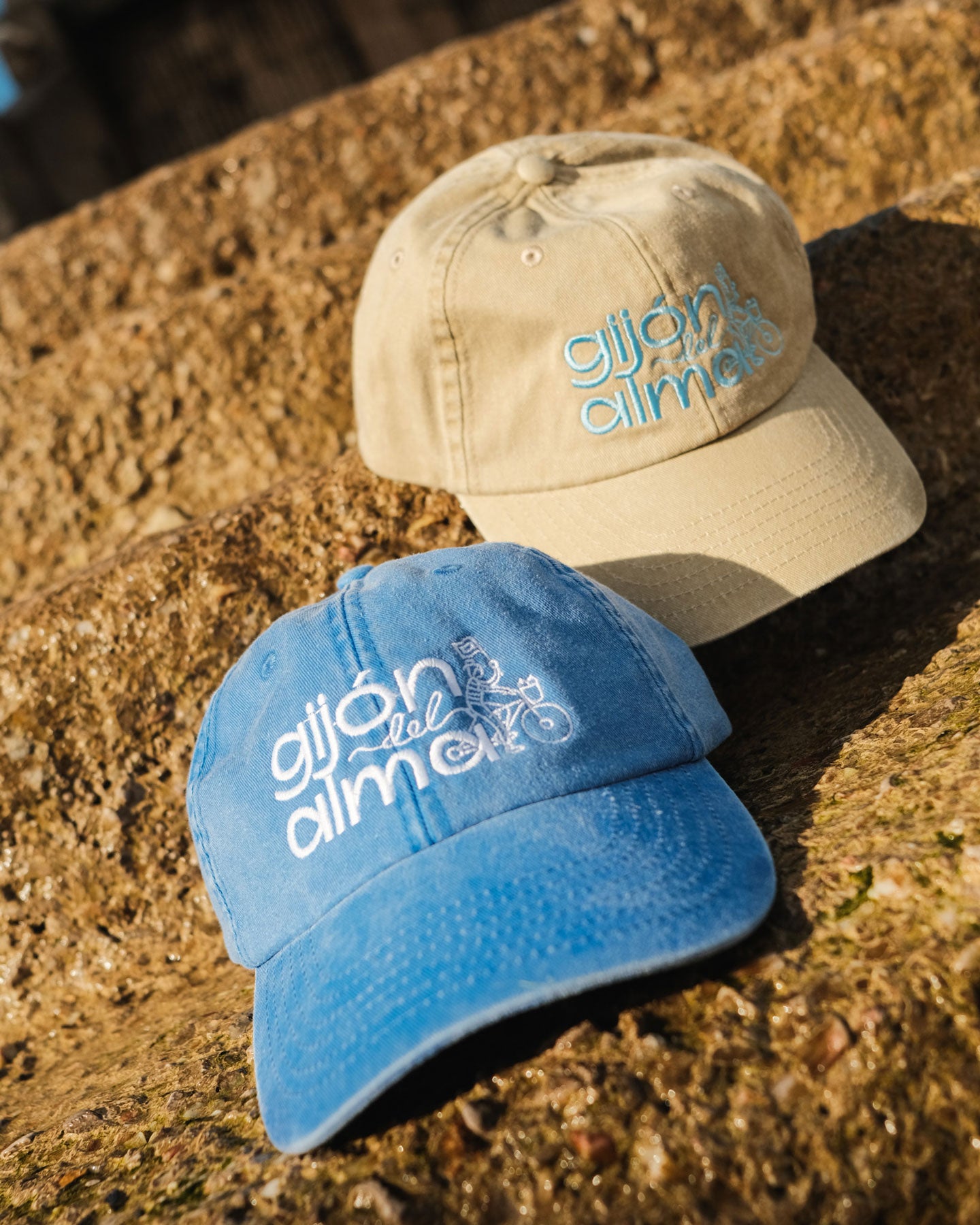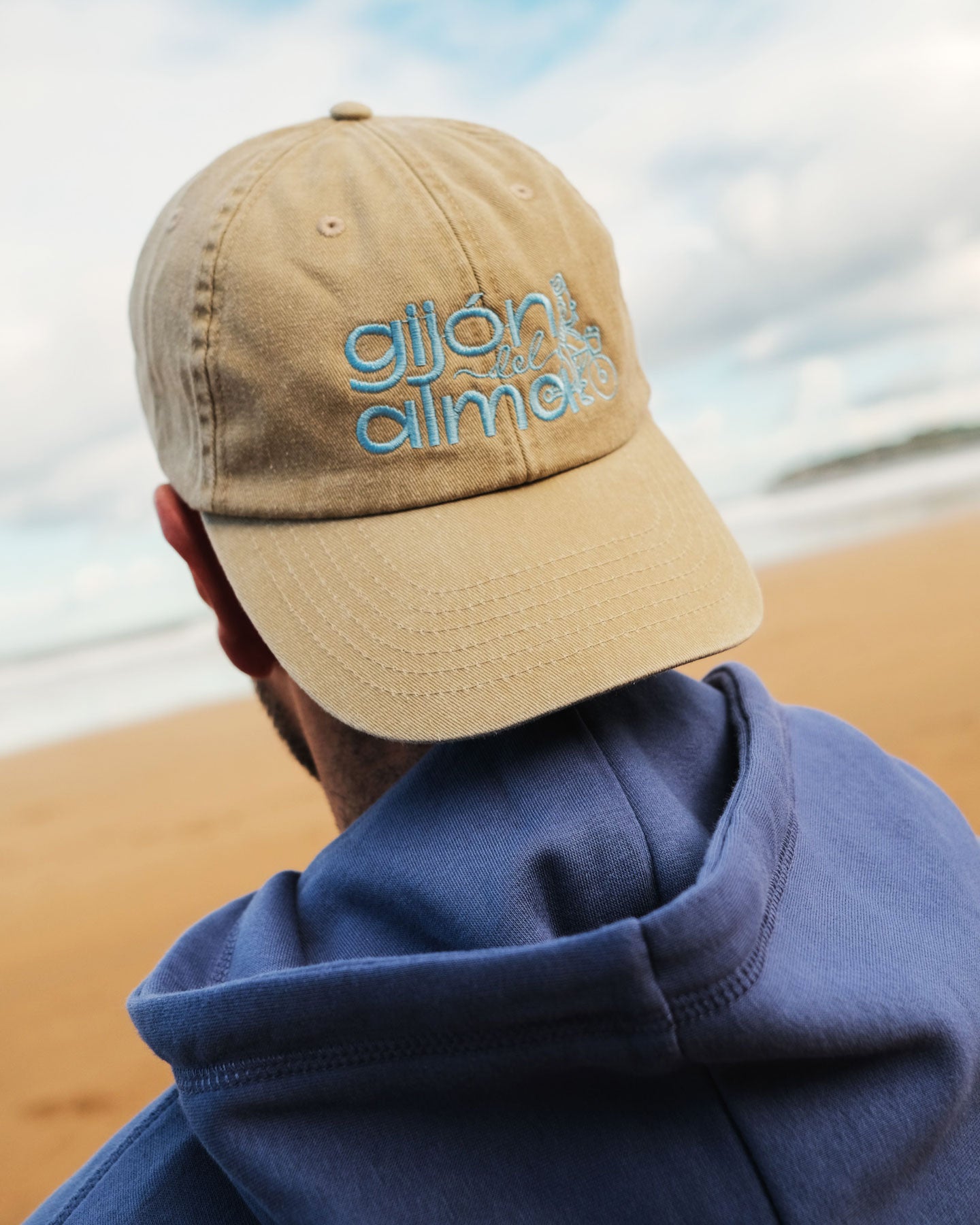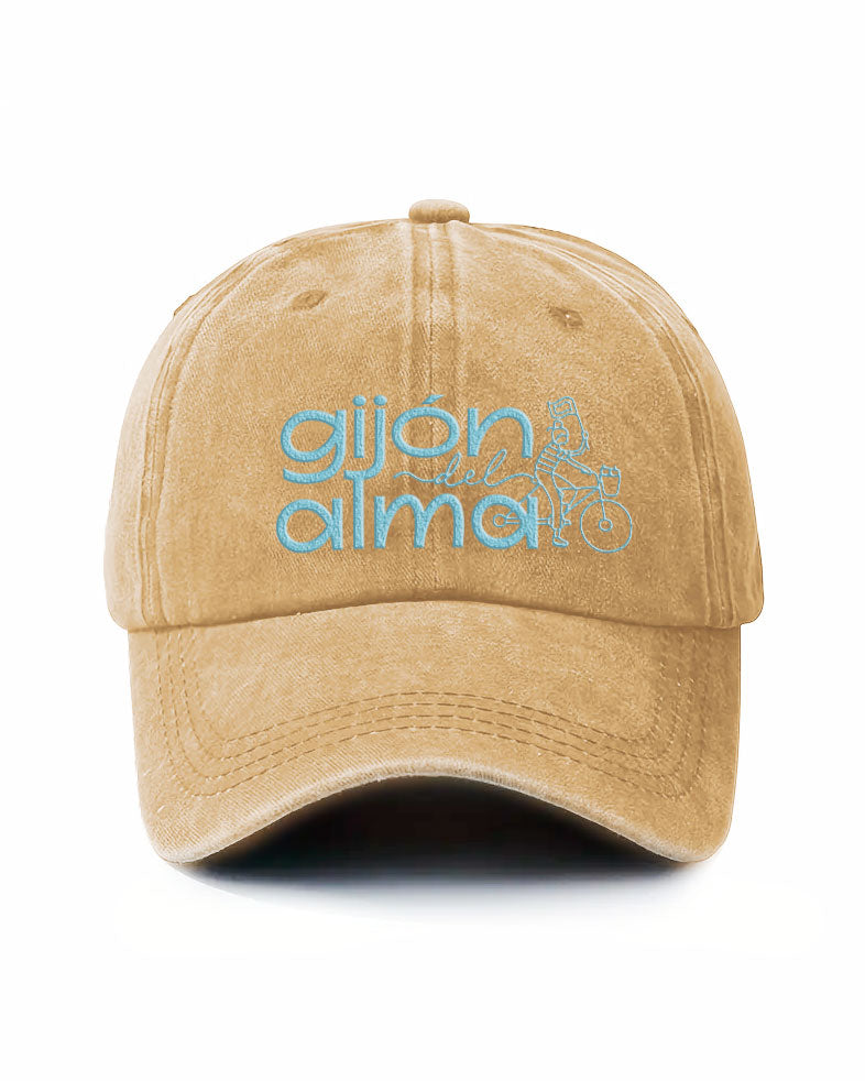 Gorra de perfil bajo estilo vintage en algodón lavado. Color arena y bordado frontal con el logo de Gijón del Alma en azul celeste. Ajustable con hebilla metálica.