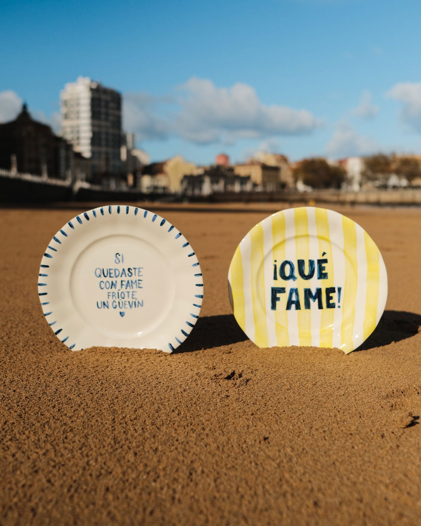 Plato de postre. Cerámica pintada a mano. Inspirado en la frase más típica de una güela asturiana: "Si quedaste con fame fríote un güevín".
